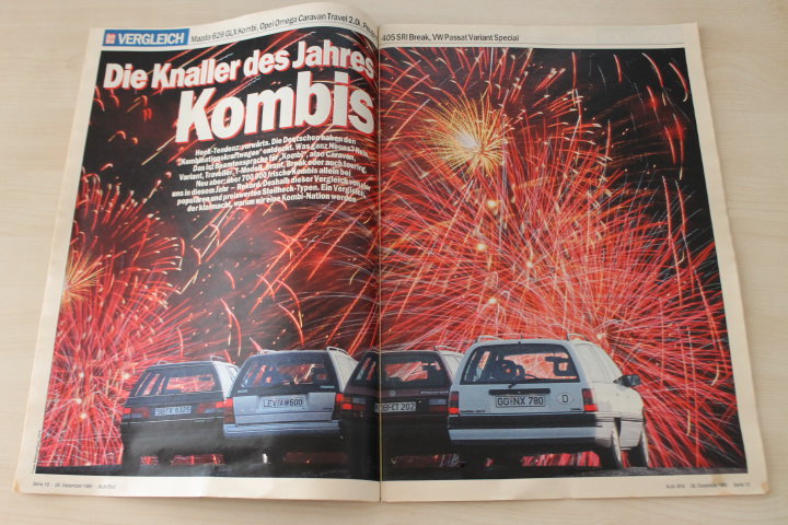 Opel Omega Caravan Travel 2.0i mit 115PS besser als Mazda 626 GLX Kombi 90PS, Peugeot 405 SRI Break mit 121PS und VW Passat Variant Special mit 115PS? Toller Vergleich auf 6 Seiten