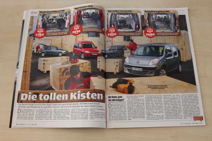 VW Caddy Life 1.9 TDI DPF mit 105PS besser als Renault Kangoo 1.5 dCi FAP Expression mit 103PS, Skoda Roomster 1.9 TDI Style DPF mit 105PS und Opel Combo 1.7 CDTI mit 100PS? Toller Vergleich auf 6 Seiten